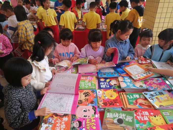 活動期間,首先在學(xué)校舉行書展,學(xué)校一千多名師生共同走進(jìn)書香世界,在知識的海洋里徜徉。根據(jù)學(xué)校安排,每節(jié)課都會由老師帶領(lǐng)不同的班級到書展現(xiàn)場。無論課間還是上課,我們都能聽到歡呼雀躍的孩子們興高采烈地奔往書展現(xiàn)場。書展現(xiàn)場更是常常里三層外三層地圍滿了天真可愛的孩子們。