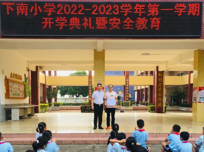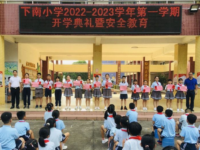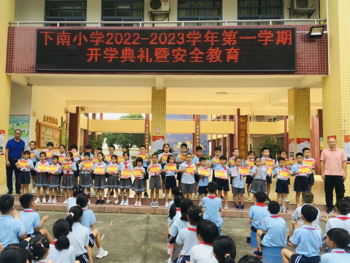 典禮的最后環(huán)節(jié)是頒獎環(huán)節(jié),在熱烈的掌聲當中,下南小學的管德豐校長、梁廣平主任、梁漢輝主任為上學期各年級的學習標兵和獲得少先隊紅領巾三星章的同學、中山市優(yōu)秀中隊輔導員陶嘉駿主任以及中山市優(yōu)秀少先隊員黃曉彤同學等師生頒發(fā)獎狀和獎品,港口鎮(zhèn)下南小學2022-2023年度第一學期開學典禮暨安全教育也在充滿喜悅的氛圍下結(jié)束。