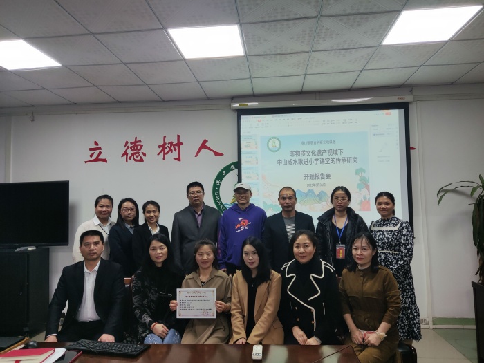 出席本次開題會(huì)的有小欖鎮(zhèn)勝龍小學(xué)咸水歌專職教師洪翠心老師、港口鎮(zhèn)教育和體育事務(wù)中心藝術(shù)專干夏榮老師、港口鎮(zhèn)教育和體育事務(wù)中心藝術(shù)專干曾凡苑老師、港口鎮(zhèn)港口中學(xué)莫謀珍老師,下南小學(xué)管德豐校長(zhǎng)、課題組全體成員及綜合科組全體教師。
