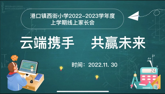 為加強(qiáng)家校溝通,提高線上教學(xué)的質(zhì)量,保障學(xué)生居家學(xué)習(xí)的身心健康發(fā)展,根據(jù)學(xué)校的工作安排,港口鎮(zhèn)西街小學(xué)于11月30日晚召開“云端攜手 共贏未來”線上家長會。為了順利開好本次線上家長會,學(xué)校領(lǐng)導(dǎo)高度重視,根據(jù)上級各項疫情防控工作的相關(guān)通知,結(jié)合當(dāng)前疫情形勢以及學(xué)校的實際情況,做出了全面部署,統(tǒng)籌安排家長會相關(guān)要點,并對各班級提出了明確要求。