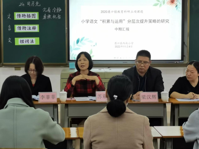 為更扎實(shí)地推進(jìn)教育科研工作,確保課題研究的實(shí)效性,提升課題研究質(zhì)量,11月7日上午,西街小學(xué)鎮(zhèn)級(jí)立項(xiàng)課題“小學(xué)語文‘積累與運(yùn)用’分層次提升策略的研究”中期報(bào)告會(huì)在大多媒體室召開。出席本次報(bào)告會(huì)的人員有港口鎮(zhèn)教育事務(wù)中心的蘇彩南老師、民主小學(xué)李菲菲副校長、下南小學(xué)教務(wù)處梁漢輝主任,西街小學(xué)梁容根校長、徐艷麗副校長以及課題組的全體老師們。會(huì)議由西街小學(xué)語文科組長施秋怡老師主持。