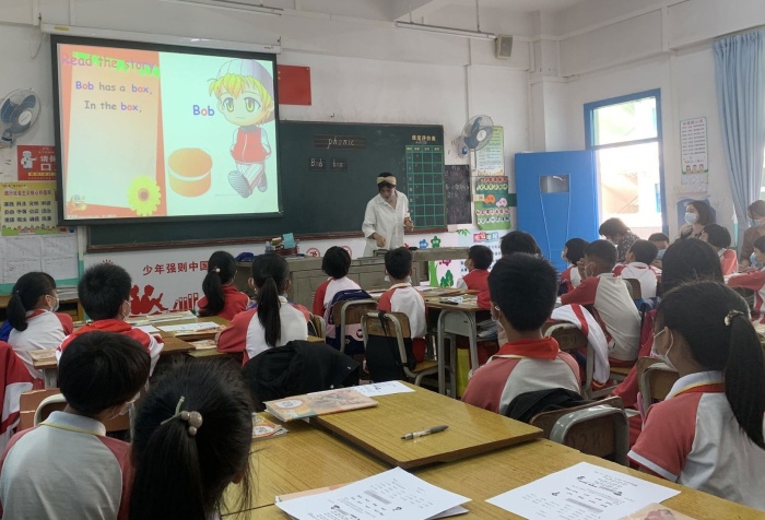 教務(wù)主任楊雨展示了三年級(jí)元音字母[?]發(fā)音的語(yǔ)音拓展課。鑒于三年級(jí)的學(xué)生活潑好動(dòng),模仿意識(shí)強(qiáng),楊主任在課前利用字母操讓學(xué)生重溫了26個(gè)字母的發(fā)音。通過(guò)Bob和Tod這兩個(gè)孩子的小故事以舊引新,通過(guò)模仿聆聽(tīng)、觀察感悟、實(shí)踐運(yùn)用,開(kāi)展字母O的語(yǔ)音教學(xué)。學(xué)生們?cè)谛〗M內(nèi)進(jìn)行發(fā)音練習(xí),在合作中提升自我。
