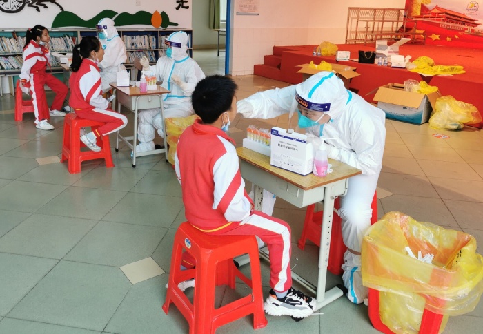 據了解,中南小學為了確保檢測過程安全有序,統(tǒng)一部署、統(tǒng)一調配、明確分工。核酸檢測前,利用學校微信工作群、班級群,向全體師生提出核酸檢測的相關要求,填寫、核對師生核酸篩查信息登記表,規(guī)范設置等候區(qū)和采樣點。