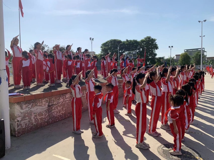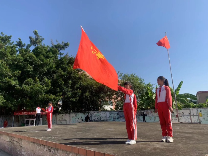 宣誓完畢后,校長丘茶芬為一年級兩個中隊(duì)授予隊(duì)旗。丘校長對新隊(duì)員們表示熱烈的祝賀,同時希望每位隊(duì)員都能夠銘記誓言,好好學(xué)習(xí),好好鍛煉,全面發(fā)展,當(dāng)好社會主義接班人。