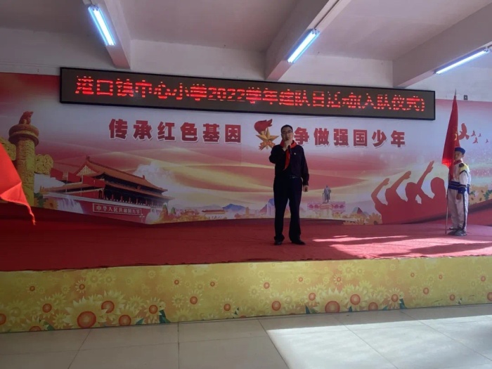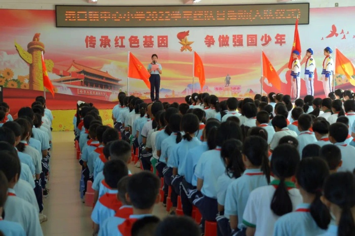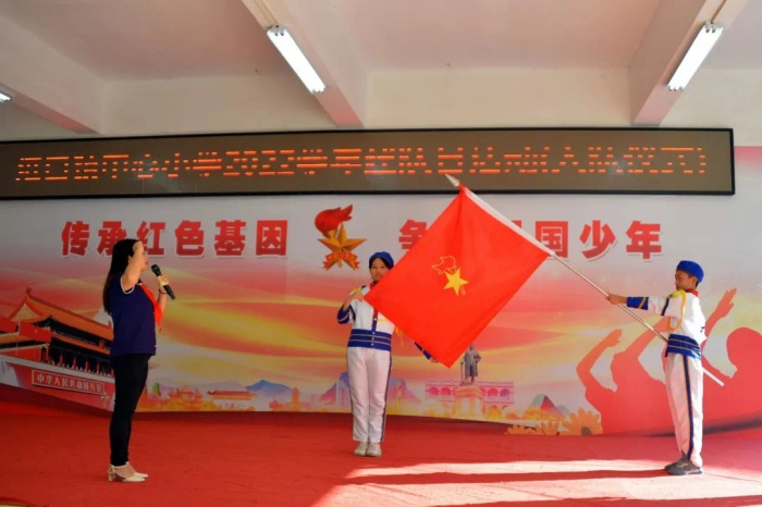 星星火炬,激揚夢想,中心小學邱玲老師領(lǐng)全體少先隊員莊嚴宣誓:“我是中國少年先鋒隊隊員。我在隊旗下宣誓:我熱愛中國共產(chǎn)黨,熱愛祖國,熱愛人民,好好學習,好好鍛煉,準備著,為共產(chǎn)主義事業(yè)貢獻力量!”