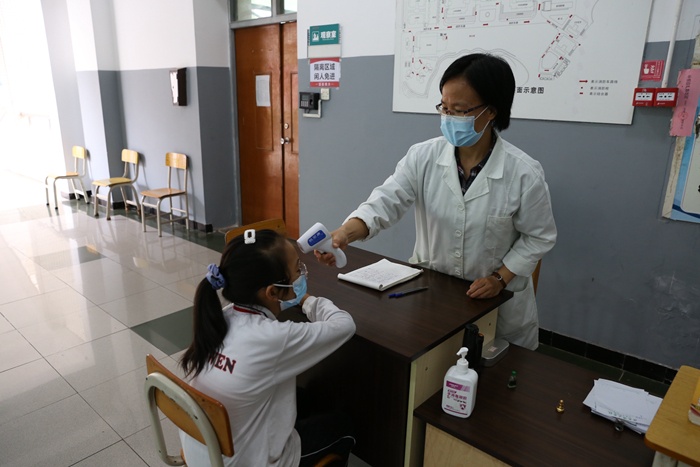 演練正式開始,學(xué)生入校前間隔一米,依次通過體溫檢測、身份核驗(yàn)方可進(jìn)校;值日老師宿舍門口手持額溫槍指引學(xué)生進(jìn)行體溫測量,一天三次對進(jìn)入宿舍師生進(jìn)行體溫檢測,異常情況及時(shí)報(bào)送校醫(yī)室并處理。學(xué)校飯?zhí)锰崆鞍才藕脤W(xué)生就餐座位,學(xué)生就餐前排隊(duì),七步洗手、排隊(duì)取餐、有序就餐、回收餐具、離開餐廳等有條不紊。