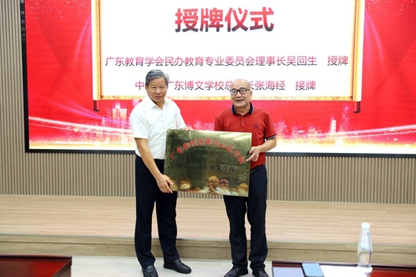 隨后是隆重的授牌儀式。吳回生理事長授予博文學(xué)?!皬V東省智慧課堂示范學(xué)?!迸曝?,博文學(xué)校校長張海經(jīng)鄭重接過牌匾并予以由衷感謝。