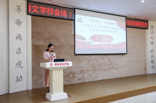 為大力宣傳疫情防控斗爭(zhēng)中涌現(xiàn)出的先進(jìn)典型,弘揚(yáng)在危難時(shí)刻挺身而出、主動(dòng)擔(dān)當(dāng)作為的無(wú)私奉獻(xiàn)精神,6月29日下午,由開發(fā)區(qū)宣傳辦、精神文明辦主辦,廣東博文學(xué)校黨支部協(xié)辦的“火炬區(qū)抗擊新冠肺炎疫情模范先進(jìn)事跡”巡回宣講活動(dòng)在廣東博文學(xué)校舉行,開發(fā)區(qū)教育事務(wù)指導(dǎo)中心副主任關(guān)影紅出席,廣東博文學(xué)校黨支部書記李敏、黨員、團(tuán)委及師生參與活動(dòng)。