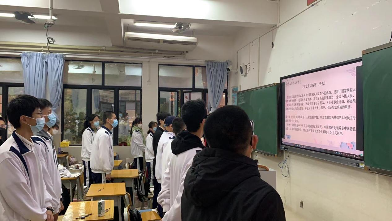 回顧歷史,改革開放以來黨和國家事業(yè)取得的歷史性成就和進步,都離不開憲法的全面有效實施,離不開全社會對憲法精神的尊崇。桂山師生會學習憲法、尊崇憲法,大力弘揚憲法精神,為全面推進依法治國貢獻力量。據(jù)悉,桂山中學為了開展好本次活動,制定了細致的活動方案。通過校園電視臺直播的形式,全校老師與學生一起參與憲法晨讀活動。所有人精神飽滿、情緒激昂,大聲跟隨誦讀,用心體會憲法的莊嚴與神圣,不僅溫習了憲法知識,更展現(xiàn)了學校師生良好的精神風貌。