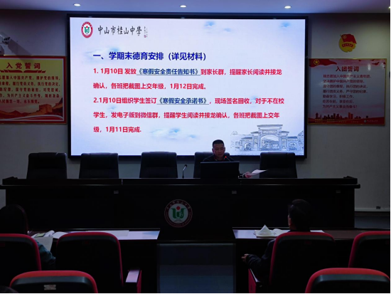 劉浩主任帶領(lǐng)老師們學(xué)習(xí)了“關(guān)于寒假期間及開學(xué)前工作安排”的相關(guān)文件,系統(tǒng)梳理了學(xué)期末的德育工作,包括:組織開展寒假安全主題校會、法治報告會、生命教育主題校會和男女生大會,組織各班對教室和宿舍開展衛(wèi)生大掃除,布置寒假德育實踐作業(yè),組織全校教師開展寒假家訪活動等。