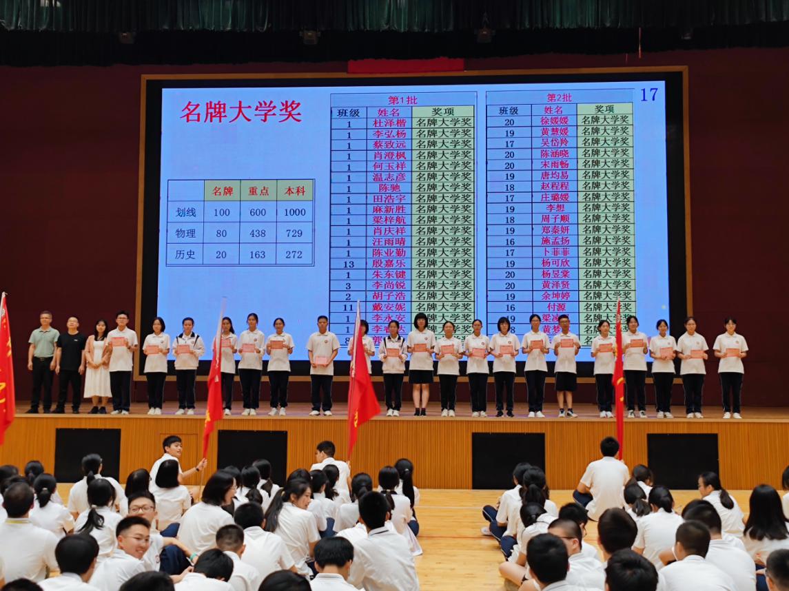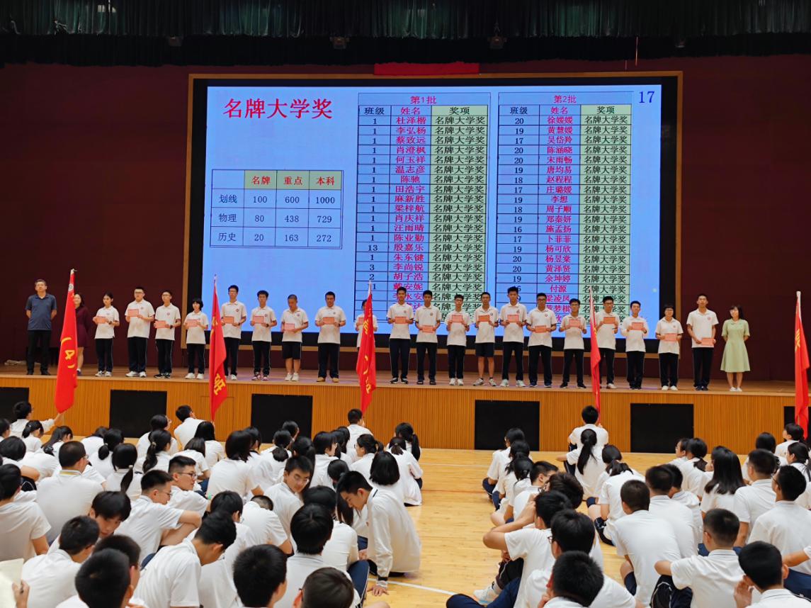 張會(huì)芬級(jí)長(zhǎng)詳細(xì)地向全體同學(xué)介紹了新高考模式下的賦分原則和成績(jī)統(tǒng)計(jì)依據(jù),并結(jié)合本次考試總體情況進(jìn)行了分析。在表彰環(huán)節(jié),獲得名牌大學(xué)獎(jiǎng)、重點(diǎn)大學(xué)獎(jiǎng)、單科獎(jiǎng)、進(jìn)步獎(jiǎng)和優(yōu)秀班集體獎(jiǎng)的同學(xué)和班級(jí)依次上臺(tái),各班班主任逐一為他們頒獎(jiǎng),臺(tái)下同學(xué)也送上熱烈的掌聲,獲獎(jiǎng)同學(xué)深受鼓舞。