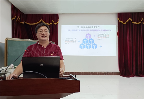 8月31日上午,中山市古鎮(zhèn)高級(jí)中學(xué)在報(bào)告廳召開全體教職工會(huì)議。校黨總支書記、校長王學(xué)成同志總結(jié)了暑假期間學(xué)校各項(xiàng)工作的推進(jìn)情況,提出了新學(xué)年學(xué)校面臨的困難和問題,從五個(gè)方面部署了新學(xué)年學(xué)校的重點(diǎn)工作:一是堅(jiān)持高質(zhì)量黨建統(tǒng)領(lǐng)各項(xiàng)工作推動(dòng)學(xué)校高質(zhì)量發(fā)展,二是堅(jiān)持五育并舉立德樹人涵養(yǎng)新時(shí)代建設(shè)者和接班人,三是堅(jiān)持科研引領(lǐng)校本研修課程推動(dòng)學(xué)校特色優(yōu)質(zhì)發(fā)展,四是鍛造誠仁博達(dá)敬業(yè)博學(xué)樂教博愛新時(shí)代幸福點(diǎn)燈人,五是點(diǎn)燃求索心燈奠基至善幸福人生建設(shè)和諧文化校園。王校長勉勵(lì)全體教師要以高度的使命感對(duì)待事業(yè),與古高發(fā)展同奮進(jìn),凝心聚力,再創(chuàng)輝煌。