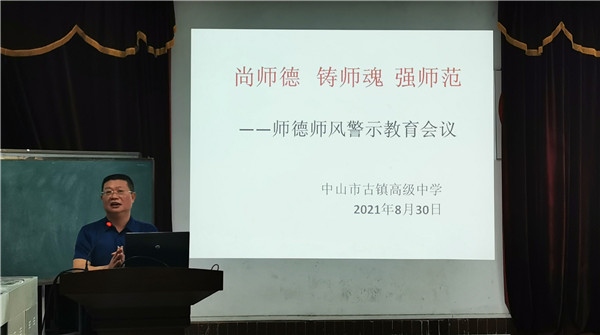 譚杰玉副校長以“尚師德,鑄師魂,強(qiáng)師范”為題進(jìn)行師德師風(fēng)警示教育,他領(lǐng)學(xué)解讀了《新時(shí)代中小學(xué)教師職業(yè)行為十項(xiàng)準(zhǔn)則》《中山市中小學(xué)有償補(bǔ)課和教師違規(guī)收受禮品禮金問題專項(xiàng)整治實(shí)施方案》《中山市師德師風(fēng)建設(shè)三年行動(dòng)計(jì)劃》等相關(guān)文件精神,要求全體教師要提高自身修養(yǎng),弘揚(yáng)新風(fēng)正氣,落實(shí)為黨育人、為國育才的根本任務(wù)。