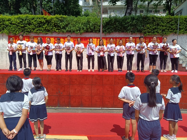 活動開始,主持人歐陽琬璇同學向全體教師致以崇高的敬意,并代表全體同學向全校老師致以節(jié)日的祝福。接著,表演隊的同學們?yōu)槔蠋煫I上了手語操表演,一首《聽我說謝謝你》帶動了全體同學,現(xiàn)場歌聲歡快的旋律伴隨著手語操動作,表達著對老師的濃濃謝意。手語操表演結束后,進行的是獻花環(huán)節(jié),老師們依次上臺接受少先隊員代表的真誠獻禮,一束束鮮花綻放代表著教師的默默耕耘、辛勤付出,一張張笑臉滿懷著對老師的敬意,少先隊員代表們將花獻給老師,向老師們表達了祝福。最后,在場的全體同學共同齊聲說“老師,祝您節(jié)日快樂”,向老師送去祝福?;顒釉谝黄瑲g快的氛圍中結束。