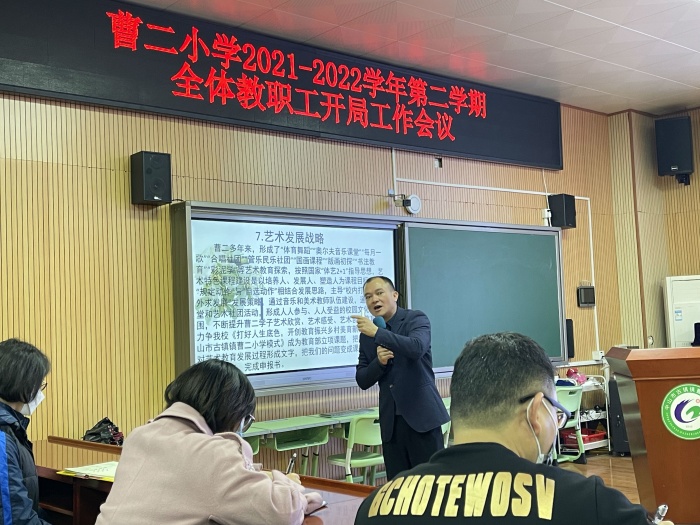 會(huì)議的第三項(xiàng)議程,邱波校長(zhǎng)向全體教職員工展示了曹二小學(xué)校園文化建設(shè)方案,指出未來幾年的辦學(xué)理念,并詳細(xì)介紹了曹二小學(xué)的六大工作方向和七大發(fā)展戰(zhàn)略。最后,邱校長(zhǎng)對(duì)學(xué)校新學(xué)期教學(xué)工作提出要求,表示對(duì)曹二小學(xué)打造體藝特色學(xué)校寄予厚望。希望全體老師明確自身的職責(zé),以踏實(shí)勤勉的工作態(tài)度共同堅(jiān)守好自己的崗位,精誠(chéng)合作、互學(xué)互促,聚焦課堂、提質(zhì)增效,為學(xué)校教育教學(xué)工作再上臺(tái)階貢獻(xiàn)力量。