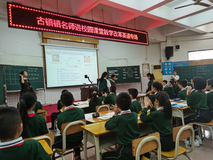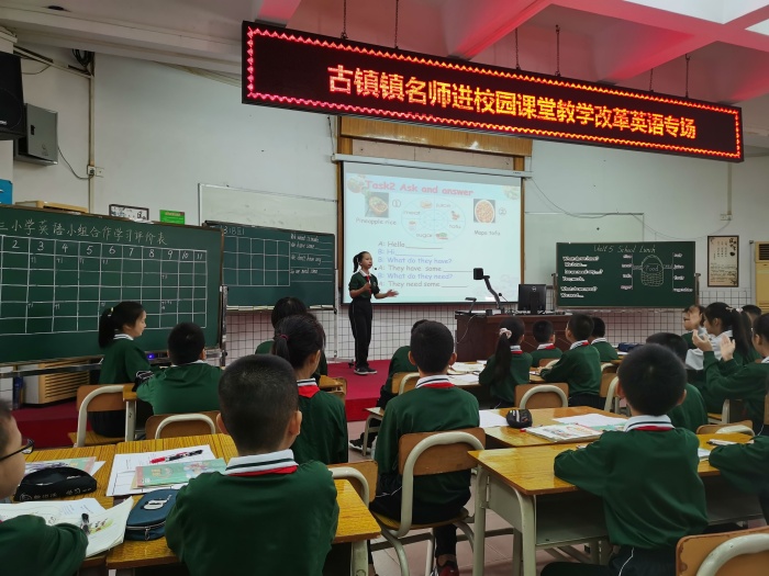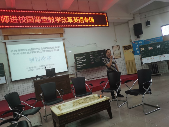 2020年11月16日早上8點(diǎn),古鎮(zhèn)鎮(zhèn)曹三小學(xué)英語(yǔ)科組開(kāi)展“名教師進(jìn)校園暨古鎮(zhèn)鎮(zhèn)課堂教學(xué)改革”專題教研活動(dòng),古鎮(zhèn)鎮(zhèn)全體小學(xué)英語(yǔ)老師觀摩。這次活動(dòng)分為三個(gè)議程,首先由黃文娣老師和黃金喬老師就如何落實(shí)小組合作學(xué)習(xí)上展示課,資深黃文娣老師執(zhí)教六年級(jí)Unit5 <A Circus in the Park>詞匯課,而年輕教師黃金喬老師執(zhí)教五年級(jí)Unit5 <School lunch>詞匯課。接著許市中學(xué)劉海霞和古鎮(zhèn)莫曉巧,蔡淑嫻老師進(jìn)行評(píng)課,最后由鎮(zhèn)教育事務(wù)指導(dǎo)中心陳和添主任做專題培訓(xùn)指導(dǎo)。