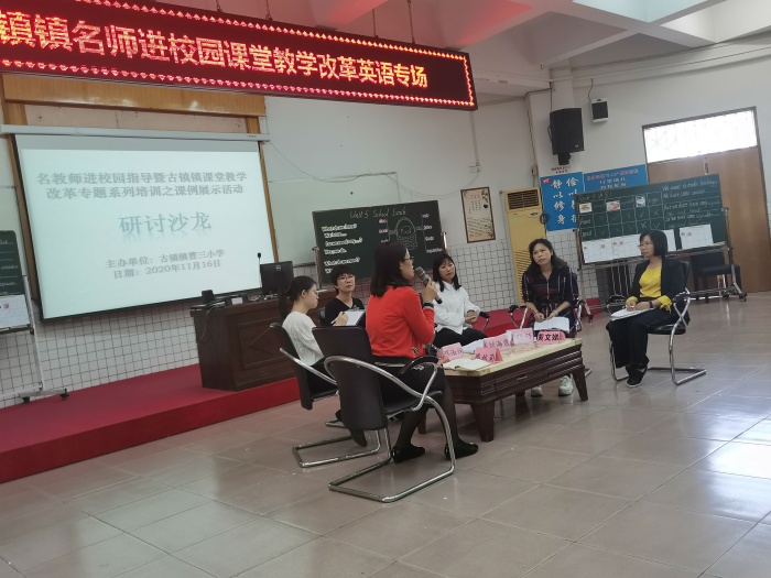 廖秋菊副校長(zhǎng)主持本次活動(dòng)。在廖校長(zhǎng)的主持下“名教師進(jìn)校園指導(dǎo)暨古鎮(zhèn)鎮(zhèn)課堂教學(xué)改革專題系列培訓(xùn)”研討沙龍,開(kāi)展得如火如荼。許市中學(xué)劉海霞老師則認(rèn)為這兩節(jié)課已經(jīng)很好地吸取小組合作與自主探究學(xué)習(xí)模板的形式和內(nèi)涵,是非常精彩的課改課例!最后,古鎮(zhèn)鎮(zhèn)教育指導(dǎo)中心陳和添主任高度肯定曹三小學(xué)的常規(guī)教學(xué)工作,高度表?yè)P(yáng)了曹三英語(yǔ)科組的改革模式,評(píng)價(jià)執(zhí)教教師能力非常出色,整體團(tuán)隊(duì)凝聚力強(qiáng),在短時(shí)間內(nèi)打造出一個(gè)非常令人滿意的創(chuàng)新型教學(xué)模式,為古鎮(zhèn)英語(yǔ)課堂改革開(kāi)創(chuàng)了精彩的先例!