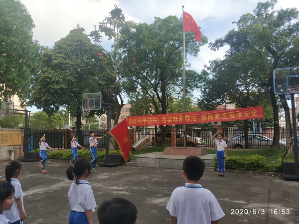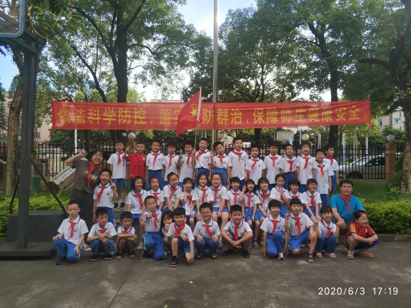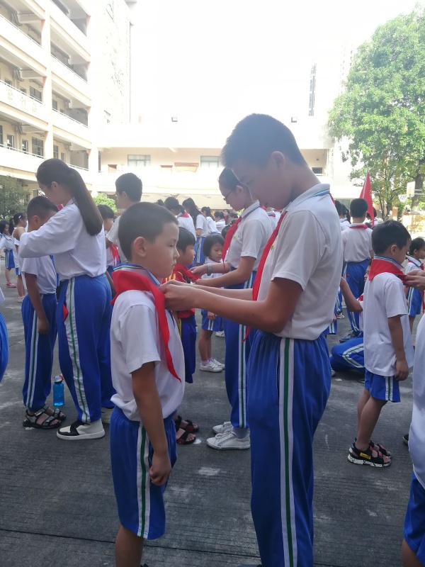 隨著雄壯高昂的旋律響起,同學(xué)們高唱《中國少年先鋒隊隊歌》,嘹亮的歌聲表達了同學(xué)們對隊組織的熱愛。緊接著,學(xué)校大隊輔導(dǎo)員彭款君老師宣讀了入隊名單,126名新隊員在歡快喜慶的音樂聲中,踏著整齊的步子、意氣風(fēng)發(fā)地走上臺來,老隊員們鄭重地為新隊員系上鮮艷的紅領(lǐng)巾,新舊老隊員互敬隊禮。新隊員代表的講話,表達了全體新隊員的心聲:“我今天終于成為了一名光榮的少先隊員,帶上了鮮艷的紅領(lǐng)巾。紅領(lǐng)巾代表國旗的一角,是我們兒童節(jié)最神圣的禮物,我一定會好好愛護它。在今后的日子里,我一定團結(jié)同學(xué),尊重老師,好好學(xué)習(xí),不辜負(fù)父母對我的期望和少先隊員這個稱號?!弊詈?,少先隊大隊輔導(dǎo)員彭款君老師帶領(lǐng)隊員們呼號,“時刻準(zhǔn)備著!”這嘹亮的呼號,在操場上空飄蕩。