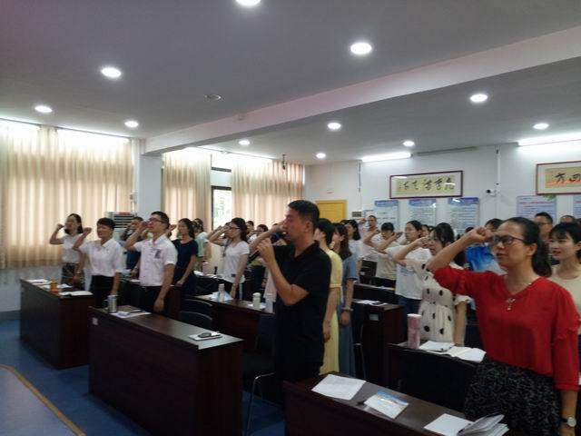 在培訓(xùn)開始前,學(xué)校德育處蔡海雄主任帶領(lǐng)全體教師進(jìn)行了莊嚴(yán)的宣誓儀式,讓教師們不忘教育初心,崇德向善,爭(zhēng)做“四有”好教師。