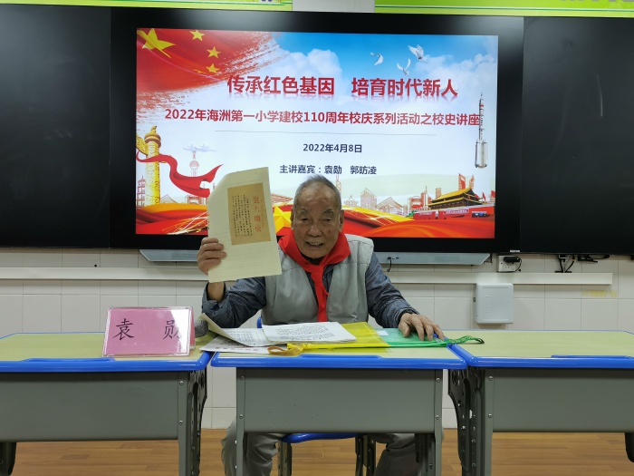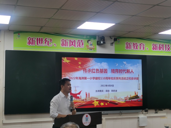 為增進全校師生對學校悠久歷史和文化底蘊的了解,激發(fā)師生學習一代代海一教育人艱苦奮斗和開拓創(chuàng)新的精神,2022年4月8日上午,海洲第一小學舉行了以“傳承紅色基因,培育時代新人”為主題的慶祝建校110周年系列活動之校史講座。古鎮(zhèn)鎮(zhèn)宣傳辦、古鎮(zhèn)鎮(zhèn)教育和體育事務中心、海洲村代表、海洲片共同體學校校長和學校全體師生聆聽講座,由海洲第一小學校長潘啟欽主持。