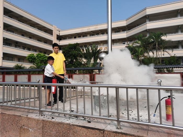 火災(zāi)應(yīng)急疏散演練后,進(jìn)行了滅火演練。學(xué)校后勤副主任賴名佩向師生解說了滅火器的正確使用方法的同時(shí),張英旋老師現(xiàn)場(chǎng)演示了如何正確使用滅火器。在賴主任和張英旋老師的配合操作下,現(xiàn)場(chǎng)準(zhǔn)備好的火箱燃起了熊熊大火,隨后,由教師代表、學(xué)生代表分別體驗(yàn)正確使用滅火器滅火。