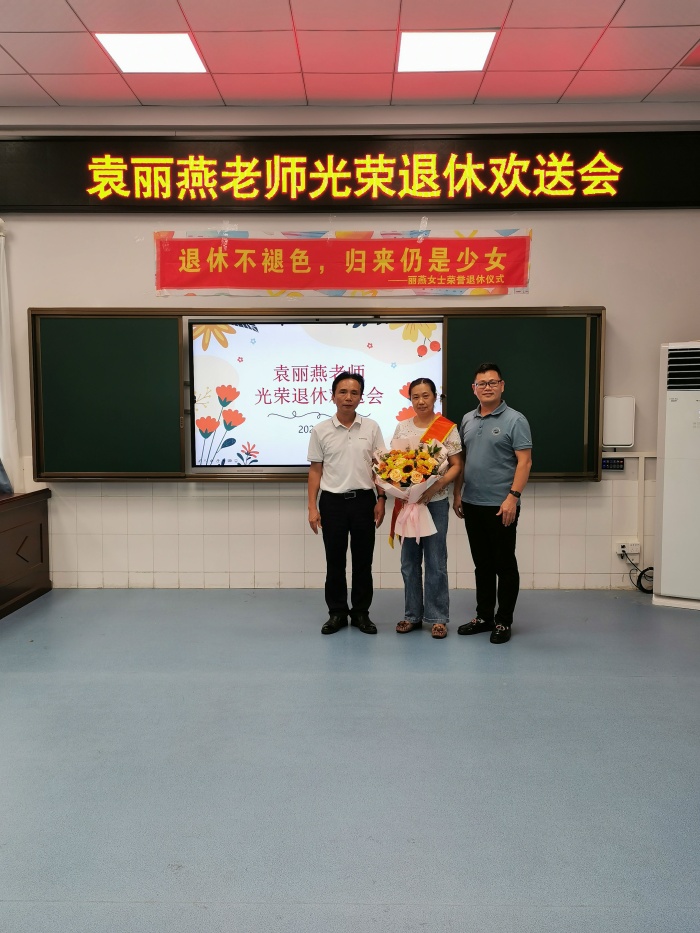 潘啟欽校長為袁麗燕老師戴上授帶,李培新副校長送上鮮花,為活動拉開了序幕。潘校長對袁老師幾十年如一日的無私奉獻(xiàn)給予了充分肯定,并對她為學(xué)校所付出的辛勤勞動表示衷心感謝。同時希望袁麗燕老師退休不退志、離崗不離心,?;貋砜纯矗蝗缂韧仃P(guān)心學(xué)校發(fā)展,支持學(xué)校發(fā)展。
