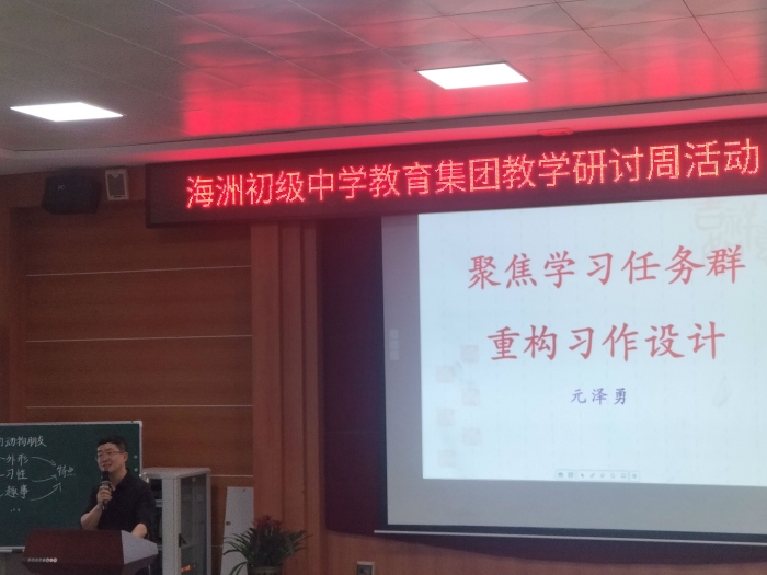 緊接著,鎮(zhèn)語(yǔ)文教研組長(zhǎng)元澤勇主任帶來(lái)題為“聚焦學(xué)習(xí)任務(wù)群、重構(gòu)習(xí)作設(shè)計(jì)”的講座。元老師從課例評(píng)價(jià)出發(fā),對(duì)于在作文教學(xué)中如何設(shè)計(jì)任務(wù)群,如何引導(dǎo)學(xué)生言語(yǔ)實(shí)踐,作了一場(chǎng)精彩的講座。