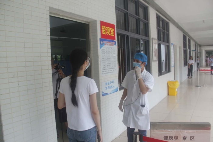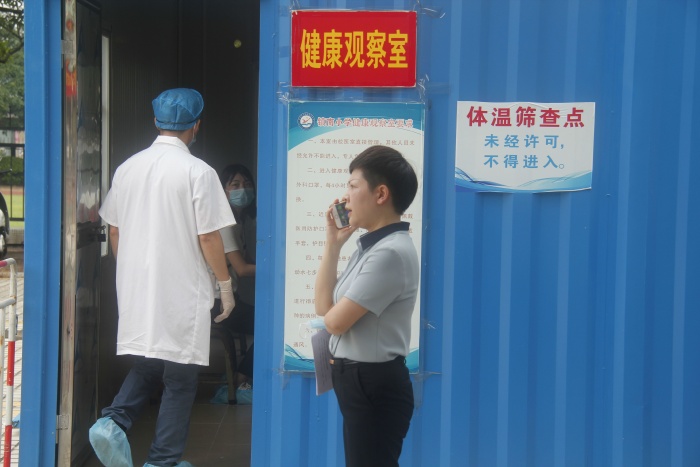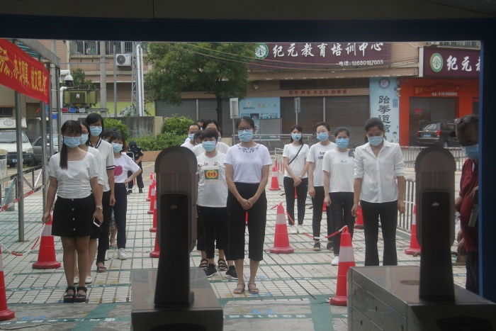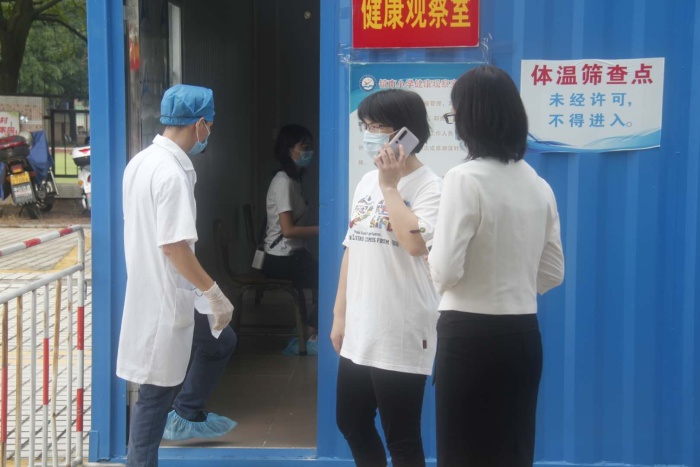 上午9點(diǎn),全體教職工身著白色上衣,黑色下裝整齊在校門口等候進(jìn)行返校入門測(cè)溫演練。參與晨檢的人員分通道按一米以上間隔排隊(duì),進(jìn)行消毒、體溫檢測(cè),做好學(xué)生晨檢準(zhǔn)備。值日老師和保安負(fù)責(zé)維持學(xué)生安全距離、檢查學(xué)生的口罩佩戴情況等,值日行政廖秋菊副校長做晨檢記錄。檢測(cè)體溫正常的學(xué)生按照指定通道進(jìn)入教室;若發(fā)現(xiàn)學(xué)生體溫高于37.3度,值日老師馬上報(bào)告值日行政,送往門口健康觀察室進(jìn)行處置。