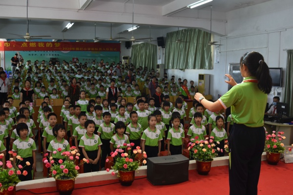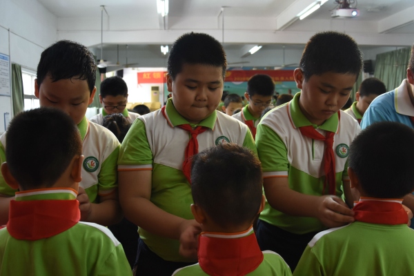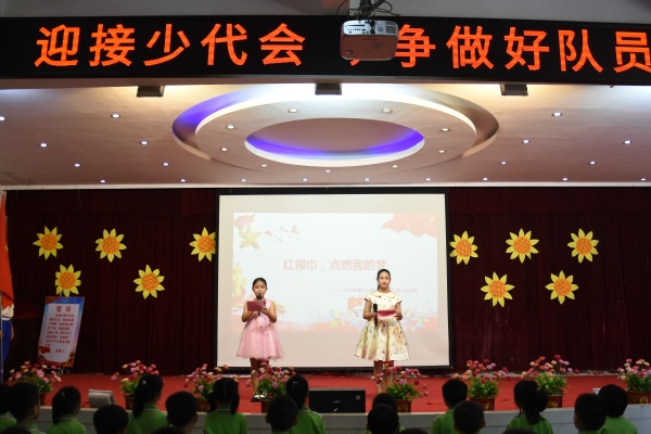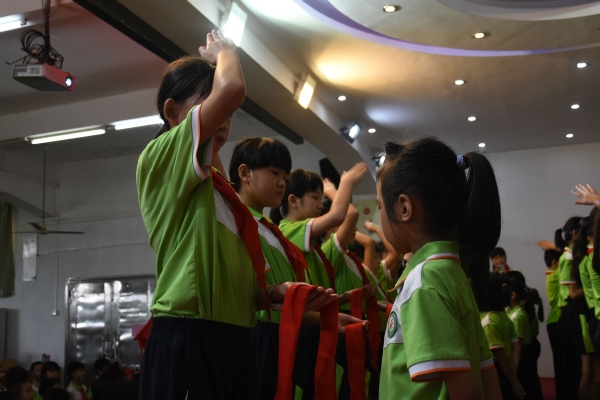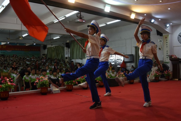 在雄壯有力的出旗曲中,少先隊入隊儀式由此拉開帷幕。接著,在大隊長的指揮下,全體隊員唱起了《中國少年先鋒隊隊歌》。嘹亮的隊歌歌聲剛落,主持人宣布了新隊員名單,五年級的老隊員們紛紛上前為新隊員佩戴紅領(lǐng)巾。優(yōu)秀少先隊員隨后也給中隊輔導(dǎo)員授紅領(lǐng)巾,大隊輔導(dǎo)員給中隊輔導(dǎo)員授中隊旗。當新隊員們都戴上了鮮艷的紅領(lǐng)巾后,在該校大隊輔導(dǎo)員廖潔怡的帶領(lǐng)下,全體新隊員鄭重地舉起右拳,在鮮艷的隊旗下莊嚴宣誓,從此成為一名光榮的少先隊員……