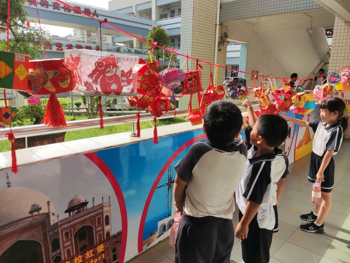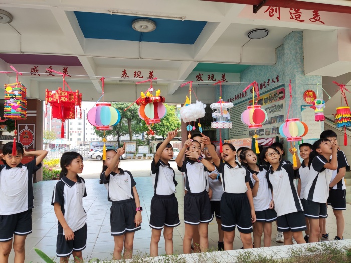 接著,三沙小學(xué)以年級為單位評選出近百個(gè)設(shè)計(jì)精巧、色彩繽紛、獨(dú)具匠心的燈籠作品。有的燈籠鮮艷熱忱,寄托濃濃的情思;有的燈籠古風(fēng)溫婉,承載中秋佳節(jié)的祝福;有的燈籠實(shí)用精巧,暗含“變廢為寶”的巧思。它們懸掛在校園之中,學(xué)生們下課后就聚集在燈籠下,興奮地跟小伙伴介紹自己的燈籠,十分歡樂。
