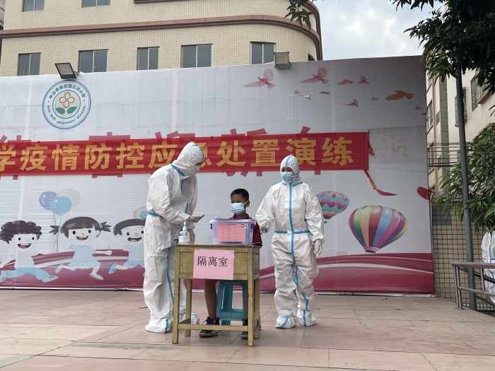 活動(dòng)首先進(jìn)行的是新冠肺炎疫情應(yīng)急處置演練。演練以模擬情景為線索,按處置的先后順序,分為“前期處置階段、應(yīng)急響應(yīng)階段(學(xué)校內(nèi)處置)、應(yīng)急處置階段(相關(guān)部門到校處置)、學(xué)校做進(jìn)程報(bào)告階段和應(yīng)急響應(yīng)終止階段”等五個(gè)流程。