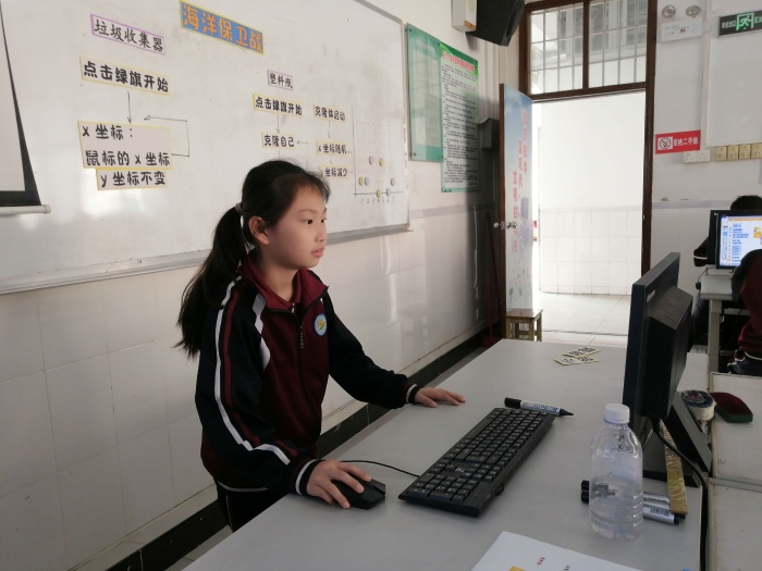 本次活動(dòng)先由三沙小學(xué)潘璀秀老師執(zhí)教課例《海洋保衛(wèi)戰(zhàn)》。潘老師以任務(wù)驅(qū)動(dòng)的形式,結(jié)合小組合作的方法,層層遞進(jìn),引導(dǎo)學(xué)生學(xué)會(huì)使用克隆指令控制角色、理解坐標(biāo)的設(shè)置方法。整節(jié)課課堂氣氛活躍,調(diào)動(dòng)了學(xué)生的思維,讓學(xué)生成為了課堂的“主人”。