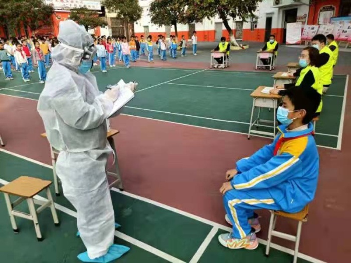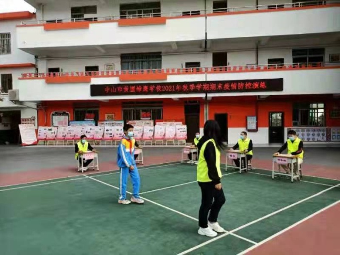 上午9:10,六年級的學(xué)生代表,分別模擬了分批入校檢測、教室上課發(fā)現(xiàn)異常學(xué)生等場景開展實(shí)地演練。重點(diǎn)演練了以下場景:在疫情低風(fēng)險(xiǎn)區(qū),學(xué)校周一上午9時(shí)接到通報(bào),雛鷹學(xué)校一名學(xué)生出現(xiàn)了發(fā)熱、咳嗽現(xiàn)象,經(jīng)初步診斷為新冠肺炎病例的密切接觸者,被轉(zhuǎn)運(yùn)后該生核酸檢測結(jié)果呈陽性,經(jīng)摸查,該生的密切接觸者共有50人。發(fā)生疫情后,學(xué)校啟動應(yīng)急預(yù)案,醫(yī)療保障組、消毒組、安全后勤保障組、信息聯(lián)絡(luò)組及宣傳和心理組做好應(yīng)急準(zhǔn)備。