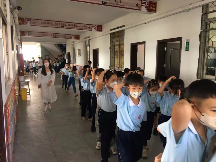 演練正式開始,值班人員立即拉響警報(bào),并撥打報(bào)警電話。隨著一聲聲消防預(yù)警號的響起,各班教師快速、有序地按照安全疏散路線帶領(lǐng)同學(xué)們用手或紙巾捂住口鼻、彎下身體,冷靜、快速疏散到操場。