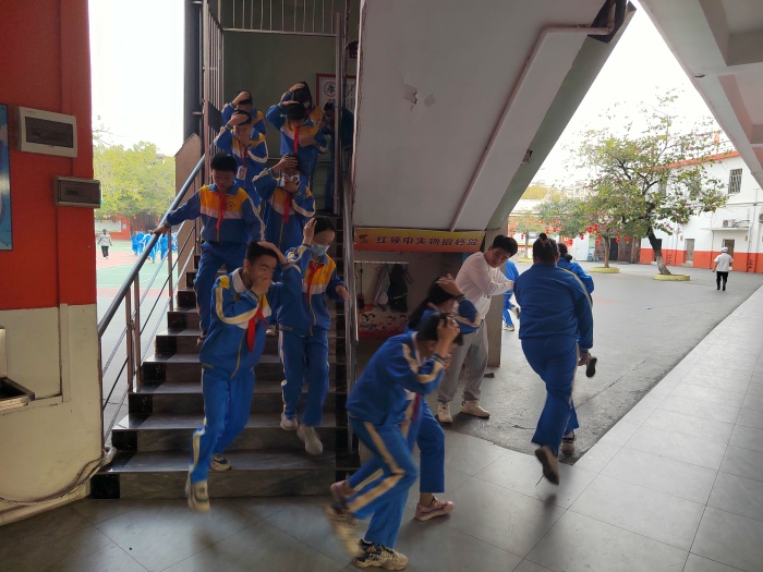 上午9:10,警鈴一響,教師們各司其職,班主任帶領(lǐng)學(xué)生從教室按照逃生路線有序撤離;任課教師在各個樓道轉(zhuǎn)角做好防護(hù)工作,以防發(fā)生擁擠或踩傷學(xué)生的現(xiàn)象;領(lǐng)導(dǎo)小組做好后勤工作,以防途中出現(xiàn)的各種意外。在撤離過程中,學(xué)生一個個表情嚴(yán)肅,在教師的帶領(lǐng)下用衣物、手帕等捂住口鼻,迅速而有序地撤離到指定的安全區(qū)域。待班上學(xué)生安置妥當(dāng),班主任立即清點人數(shù)并逐級上報,確保不丟下一個學(xué)生。