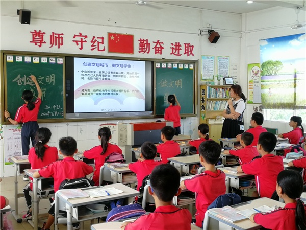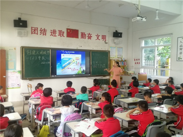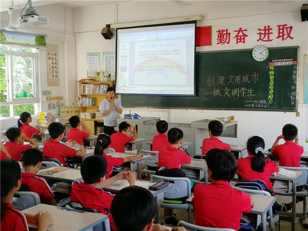 班會課上,各班主任們進行創(chuàng)建文明城市知識宣傳,倡導(dǎo)學(xué)生們從自己做起,從小事做起,從身邊做起,爭當(dāng)文明小市民;通過PPT課件,讓學(xué)生懂得亂闖紅燈、亂吐亂扔、亂寫亂畫、亂掛亂貼是影響環(huán)境衛(wèi)生的不文明行為,希望能通過孩子對不文明行為的勸導(dǎo),潛移默化地影響大人及家庭的文明行為,從而促進城市文明創(chuàng)建活動的開展。