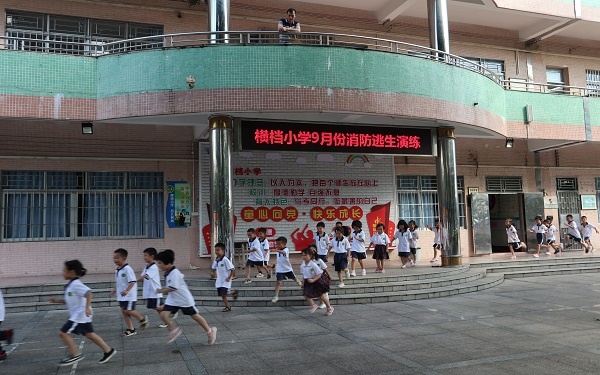 演練前,橫檔小學對演練進行了組織和策劃,明確了演練步驟、老師職責、疏散路線等具體要求,各班主任也在演練前對學生進行了消防安全知識教育,使學生學會如何預防火災,如何在火場自救逃生。上午8點50分,隨著消防報警聲的響起,各樓層指揮人員迅速到班到崗,沉著冷靜地指揮學生盡量將身體放低,沿著走道快速前進,緊急撤離教學樓。在老師的指揮下,學生都能安全、快速、有序地疏散到學校操場和足球場,班主任隨即清點人數(shù)。演練從“火情”開始到學生完全撤離到安全區(qū)域,共用時1分20秒,整個過程迅速有序,取得圓滿成功。演練結束后,橫檔小學招權民主任對本次消防演練進行了總結。