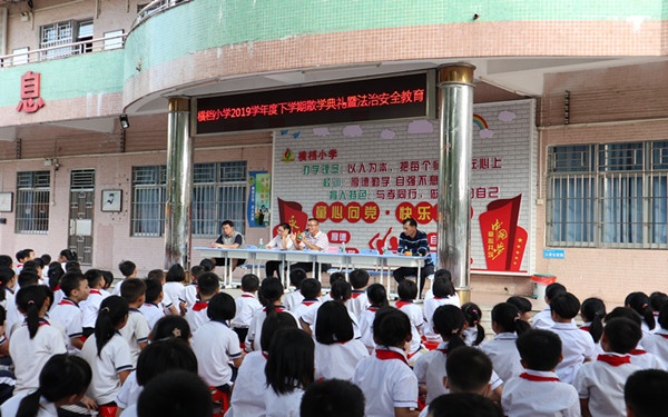 7月17日早上八點(diǎn)正,陽光燦爛,橫檔小學(xué)集合全體師生在教學(xué)樓前舉行2019學(xué)年下學(xué)期散學(xué)典禮暨法治安全教育。