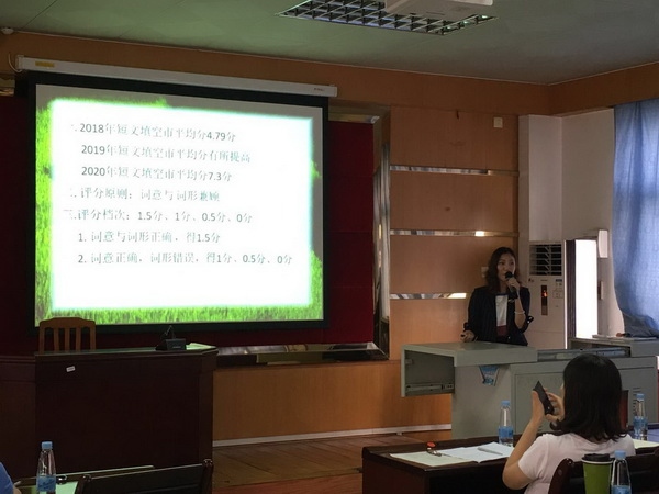 第二項議程是由黃圃鎮(zhèn)中學(xué)黃彩玲、李秀珍老師以及馬新中學(xué)劉偉令老師三位參與中考評卷的老師分別就短文填空、寫作、回答問題三種題型進行評卷反饋并提出教學(xué)建議。三位認(rèn)真分析解讀了評分標(biāo)準(zhǔn)的每一項內(nèi)容,讓在場的很多老師茅塞頓開,恍然大悟,掌聲不斷。