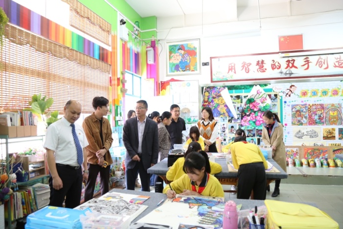第四個(gè)環(huán)節(jié)由評(píng)估小組分組查閱資料,巡視校園并進(jìn)行實(shí)地考察,前往美術(shù)室、書法室、榕創(chuàng)室等參觀學(xué)生們現(xiàn)場(chǎng)繪畫、紙漿畫制作、書法揮毫、STEM教育成果展示等,輔導(dǎo)老師詳細(xì)介紹活動(dòng)開展情況,評(píng)估組老師還親自體驗(yàn)科技作品的應(yīng)用。