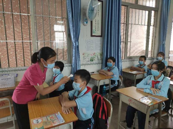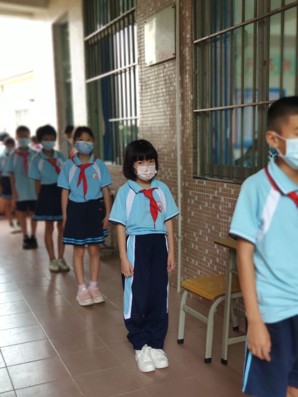 課間休息時,同學們排著隊伍,互相間隔1米,錯峰上洗手間,并按照“七步洗手法”洗手消毒。課間玩耍也是保持安全距離。根據(jù)錯峰放學原則,先給學生測體溫。學生有序排隊,不擁擠、不聚集,保持間距,在老師的守護中平安離開校園。