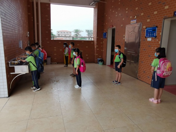 早晨七點(diǎn),學(xué)校行政人員和全體教職工各司其職,在不同崗位等候吳欄小學(xué)學(xué)子們歸來(lái)。校園門(mén)口體溫監(jiān)測(cè)通道準(zhǔn)時(shí)開(kāi)啟,同學(xué)們按照學(xué)校報(bào)到要求,陸續(xù)錯(cuò)峰返校。他們佩戴口罩,根據(jù)地面標(biāo)示線(xiàn),有序間隔一米距離排隊(duì)。負(fù)責(zé)體溫檢測(cè)的老師逐一檢測(cè)同學(xué)們的體溫,測(cè)溫正常的同學(xué)們回到班級(jí)所在樓層洗手處進(jìn)行洗手,只見(jiàn)同學(xué)們認(rèn)真地按照“七步洗手法”洗刷他們的稚嫩的小手,然后按照指定通道進(jìn)入教室。