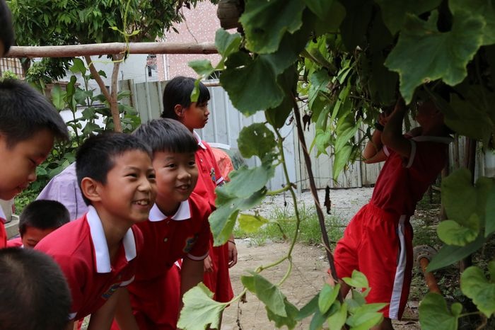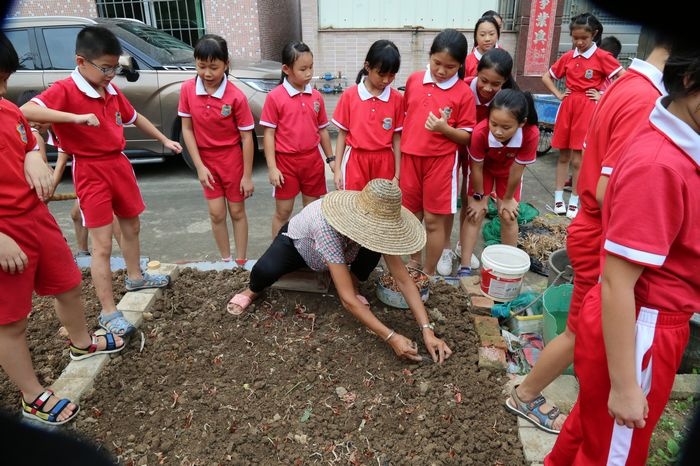 本次揭牌儀式的嘉賓為黃圃鎮(zhèn)教育和體育服務中心副主任袁港喜先生、農(nóng)場主即學生家長:羅洛怡家長、郭靖然家長、新地中心小學校長吳國有先生、科學教師陳漸成和陳藹齡老師以及50名學生代表。首先,由袁港喜先生、吳國有校長、農(nóng)場主、陳漸成老師進行簡單而隆重的揭牌儀式。隨后,鄧蛟龍主任針對新地中心小學勞動教育教學計劃進行介紹,并提出勞動教育將進一步在新地中心小學得到落實,專設勞動教育必修課、開展一系列勞動主題教育活動等。緊接著由陳漸成老師帶領學生代表參觀勞動實踐基地,并進行講解。在陳漸成老師的帶領下,學生嘗試如何拔草,知道如何制作以果蔬等廚余垃圾為原材料的肥料,了解粉葛的生長周期,對比韭菜與蔥的區(qū)別,體驗勞動實踐的樂趣??鞓返臅r光總是短暫的,學生們依依不舍的離開勞動基地,期待再一次的到來。