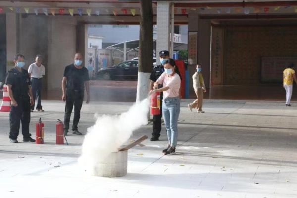 參加本次消防安全演練的有全校教師、保安人員、后勤工作人員。實踐是檢驗一切的真理,參與消防演練的人員有序在校內(nèi)的空曠地區(qū)展開了滅火器的實際操作使用。場地中間已經(jīng)備好模擬著火用的鐵皮桶,放好了可燃物。鄧蛟龍主任首先給學(xué)校教師詳細講解了消防安全的重要性、火災(zāi)發(fā)生初期的補救辦法等消防知識。接著,由黃圃鎮(zhèn)保安公司的潘榮超消防員講解了手提式滅火器的正確使用方法。為了提高教師的實操能力,他拿起滅火器對準正在燃燒的火苗,一邊示范一邊講解:首先一只手握住噴筒把手,另一只手拔去保險栓,站在上風口,將扶把上的鴨嘴壓下,對準火源根部滅火。經(jīng)過一番精彩的滅火演示,老師們個個躍躍欲試。培訓(xùn)老師又指導(dǎo)教師進行了實地滅火演練,許多老師都大膽地拿起滅火器,實地操作,很快學(xué)會了使用滅火器。