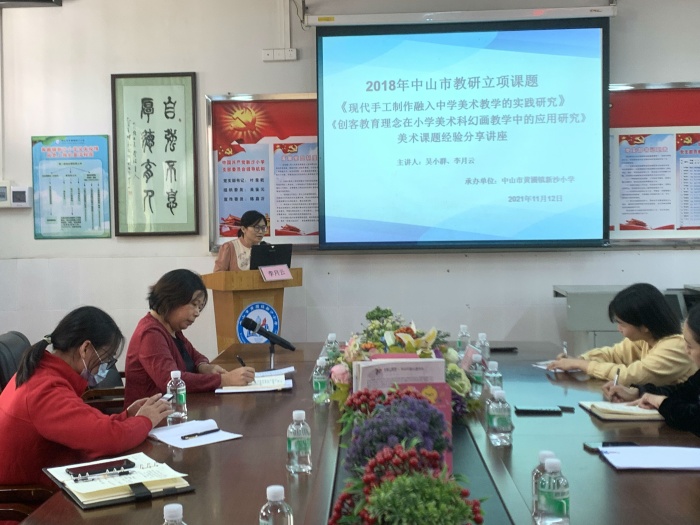 為進(jìn)一步提升美術(shù)教師科研水平和教學(xué)能力,加強(qiáng)科研和教學(xué)經(jīng)驗(yàn)交流、促進(jìn)教育教學(xué)水平的提高,總結(jié)推廣新沙小學(xué)2018中山市教育科研立項(xiàng)課題《創(chuàng)客教育理念在小學(xué)美術(shù)科幻畫中的應(yīng)用研究》研究經(jīng)驗(yàn)與成果,引領(lǐng)課題研究活動(dòng)科學(xué)、規(guī)范開展。2021年11月12日下午,黃圃鎮(zhèn)美術(shù)教研活動(dòng)“美術(shù)課題經(jīng)驗(yàn)分享講座”在新沙小學(xué)舉行,課題主持人李月云老師作為主講人。黃圃鎮(zhèn)教育和體育事務(wù)中心藝術(shù)專干杜晗婷老師以及黃圃鎮(zhèn)中小學(xué)美術(shù)教師參加本次活動(dòng)。
