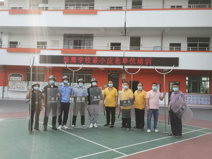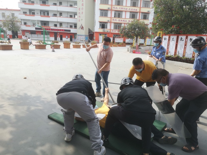 培訓中,雛鷹學校安全處黃字由主任解讀了“最小應急單元”的含義,“最小應急單元”是指以第一時間發(fā)現隱患苗頭、第一時間控制風險擴大、第一時間處置常規(guī)可控事件為原則,實現1分鐘自救、3分鐘互救、5分鐘增援到位的目標,盡可能把突發(fā)事件的危害降到最低,最大限度減少人員傷亡及財產損失。接著,黃主任對校園安?;局R和操作進行培訓,并現場講解演示盾牌、防爆鋼叉、長棍等防護器材的使用方法。隨后,最小應急單元聯(lián)合進行了一次校園突發(fā)事件聯(lián)動聯(lián)防處置演練,演練分別選取上學、放學時段,“不法分子”企圖強行進入校園兩個場景進行模擬演練?,F場,由學校教師扮演的“不法分子”企圖進入校園,正在執(zhí)勤的保安員迅速反應,立即用安全鋼叉進行制止,同時通過110、一鍵式緊急報警等方式向公安機關報告。在場老師、家長志愿者迅速疏散學生,并合力圍堵制服“不法分子”。最后,“不法分子”被趕來的警察擒獲,避免了傷人事故。