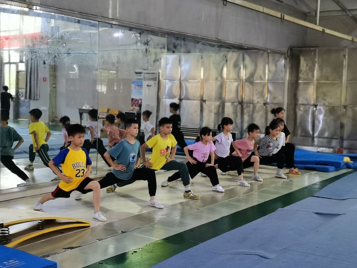武術隊的隊員們個個精神抖擻,出招、跳躍、翻滾,每套動作行云流水,一招一式剛勁有力,令人賞心悅目。隊員們有時練一個動作都得重復十幾遍甚至幾十遍。運動員們在練習難度動作——單跳后空翻落地,膝蓋經常被砸腫,在這種情況下,隊員們仍然堅持訓練。為了難度的穩(wěn)定性,每一個運動員們都不厭其煩地練習,憑借著對武術的這份熱愛,教練和孩子們一起克服了重重的困難。