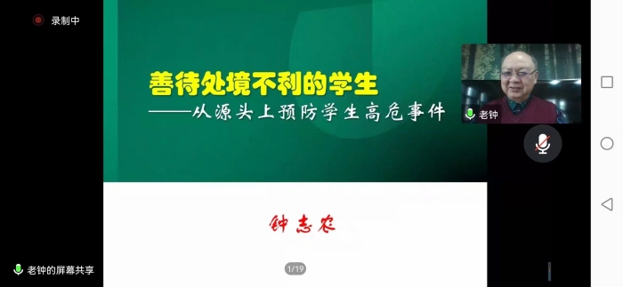 心理健康教育注重全體,還需關(guān)注學(xué)生個體發(fā)展,特別是有迫切心理需要的學(xué)生。浙江省心理特級教師鐘志農(nóng)老師做了“善待處境不利的學(xué)生——從源頭上預(yù)防學(xué)生高危事件”的專題講座。鐘老師從一例令人扼腕的案例說起,引出青少年危機(jī)干預(yù)的誤區(qū),強(qiáng)調(diào)我們應(yīng)重點關(guān)注長期處境不利的學(xué)生。接著用具體的案例分析這類學(xué)生的特點與干預(yù)策略。鐘老師抽絲剝繭,從處境不利學(xué)生的特點和需要分析,強(qiáng)調(diào)危機(jī)干預(yù)工作重在察微知著,未雨綢繆,應(yīng)在日常心理輔導(dǎo)等工作中發(fā)揮好“監(jiān)測站”的作用,守護(hù)好學(xué)生的心理防線。