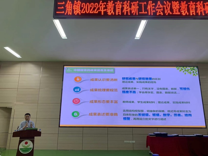 為扎實(shí)做好2022年全鎮(zhèn)教育科研工作,促進(jìn)省、市、鎮(zhèn)教育科研成果的轉(zhuǎn)化與推廣,進(jìn)一步提升全鎮(zhèn)廣大教師的教育科研能力,推動(dòng)科研興教、科研強(qiáng)師工作,11月24日上午,三角鎮(zhèn)在中心小學(xué)舉行2022年教育科研成果推介會(huì)。三角鎮(zhèn)教育和體育事務(wù)中心梁文副主任、三角鎮(zhèn)中心小學(xué)吳博事校長(zhǎng)、中心小學(xué)李紅娣老師、三角中學(xué)陳秀君老師、三角中學(xué)李建華老師以及獲得省市鎮(zhèn)科研成果獎(jiǎng)(小學(xué)階段)和2020年度市鎮(zhèn)級(jí)立項(xiàng)課題(小學(xué)階段)的主持人參加推介會(huì)。本次會(huì)議主要議程為省、市、鎮(zhèn)科研成果獲獎(jiǎng)?wù)n題主持人頒獎(jiǎng)、優(yōu)秀科研成果推介、專家點(diǎn)評(píng)和專題講座。