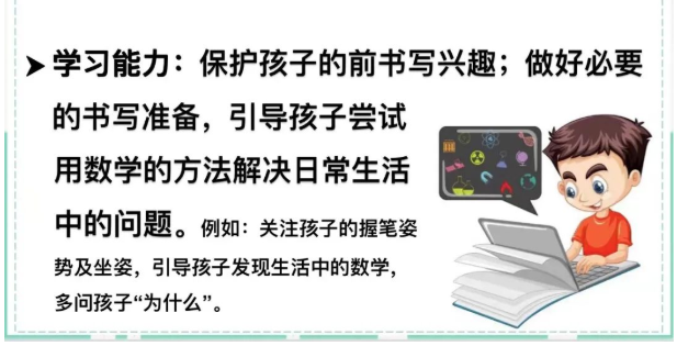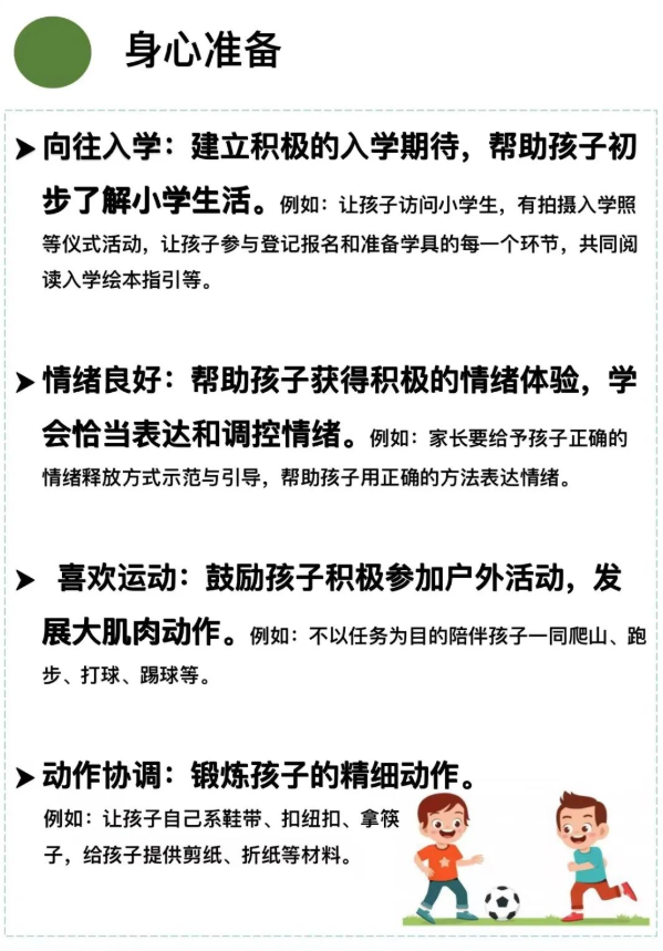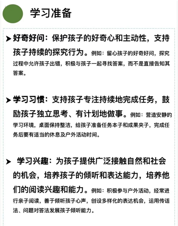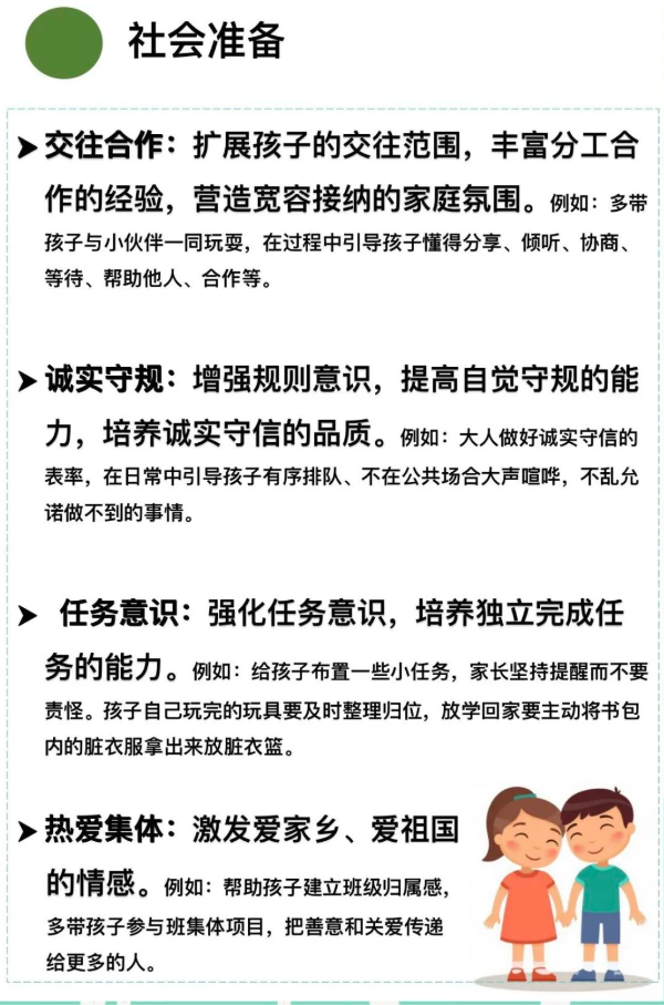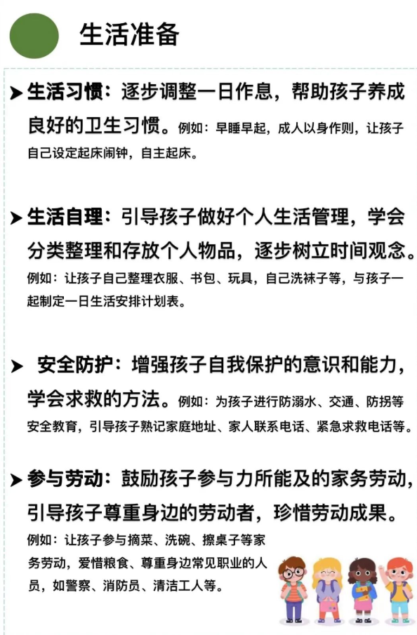為讓家長(zhǎng)更好地開展幼小銜接家庭教育工作,我園整理了身心準(zhǔn)備、生活準(zhǔn)備、社會(huì)準(zhǔn)備、學(xué)習(xí)準(zhǔn)備四方面的家庭版本指南供家長(zhǎng)參考。